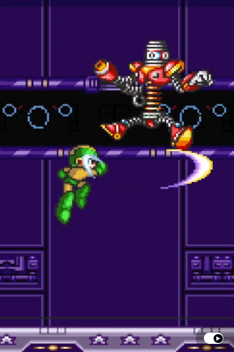 Spring Man will jump to the center of the room, then jump straight up. With good timing, you can jump and slash him just as his iframes run out (pictured above). The timing is somewhat tight but doable.